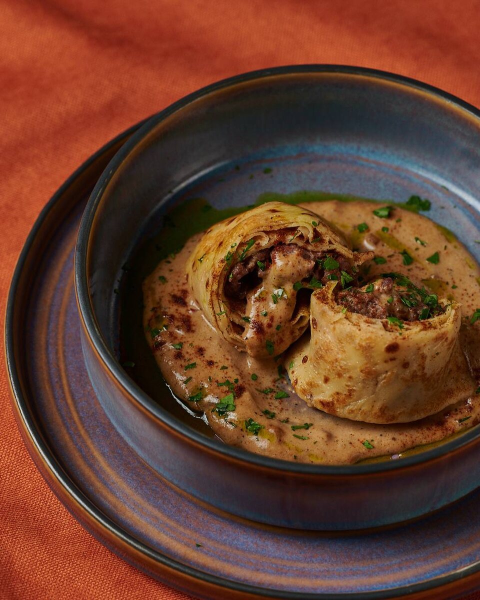 ! Нежный вкус блинного теста гармонично сочетается с пикантностью перечного соуса, а зелень и зелёное масло добавляют блюду особую свежесть и яркость. Каждый укус — маленькое гастрономическое путешествие в мир традиционных вкусов 🫶🏼