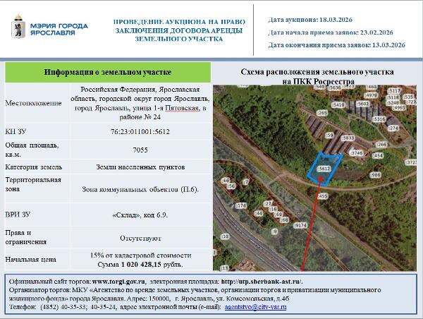 Канал: Госземля Ярославская область Область: обл Ярославская Район: г.о. город Ярославль Населенный пункт: г Ярославль город Ярославль, улица 1-я Пятовская, в районе № 24 Локация: Смотреть на карте ВРИ: Склад Кадастровый номер: 76:23:011001:5612 Кадастровая стоимость: - Вид сделки: Аренда Площадь: 7055 м² Начальная цена: 1020428.00 руб. Дата завершения: 13.03.2026 Подробнее: ГИС ТОРГИ #госземля #земляотгосударства #земля #земельныйучасток #земельныеторги #торги #аукцион #арендаземли #аренда #ярославскаяобласть
