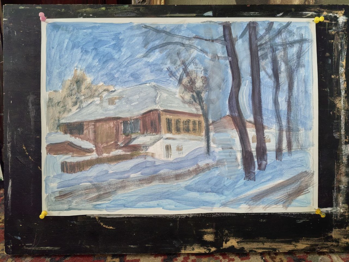 Часто хожу мимо этого домика во время прогулок с собакой, и давно присматривалась к нему. Планировала написать этот мотив ещё летом, маслом, но не сложилось. (Признаюсь, композицию взяла с фотографии.)