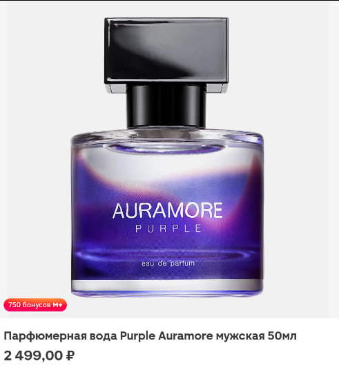 Я уже кратко и по делу написала об этой сложной схеме в Телеграм-канале. Теперь длинно и подробно напишу в Дзене. Сейчас в Магнит Косметик, если ничего не изменилось на момент выхода статьи, можно получить мужскую парфюмерную воду выгодно, бесплатно или даже выйти в плюс. Смотря сколько акций вам доступно и сколько сможете совместить. Даже если скоро это совмещение акций будет неактуально, всё равно полезно ознакомиться, чтобы в будущем знать, как это работает - что с чем складывается в Магните. В доставке Магнит Косметик есть такая вода - "Purple Auramore" стоимостью 2500 рублей, за покупку начисляют 750 бонусов. В самом магазине она стоит 1750 рублей без всяких бонусов, сразу дешевле. "В магазине купить выгоднее" - сказал бы человек, не увлекающийся акциями, скидками и промокодами. Но я получу эти духи бесплатно и Магниту придётся даже немного доплатить мне, чтобы я их забрала. Добавляем воду в корзину, выбираем самовывоз. Применяем промокод ВАШ40, если он доступен. Если нет, то смо