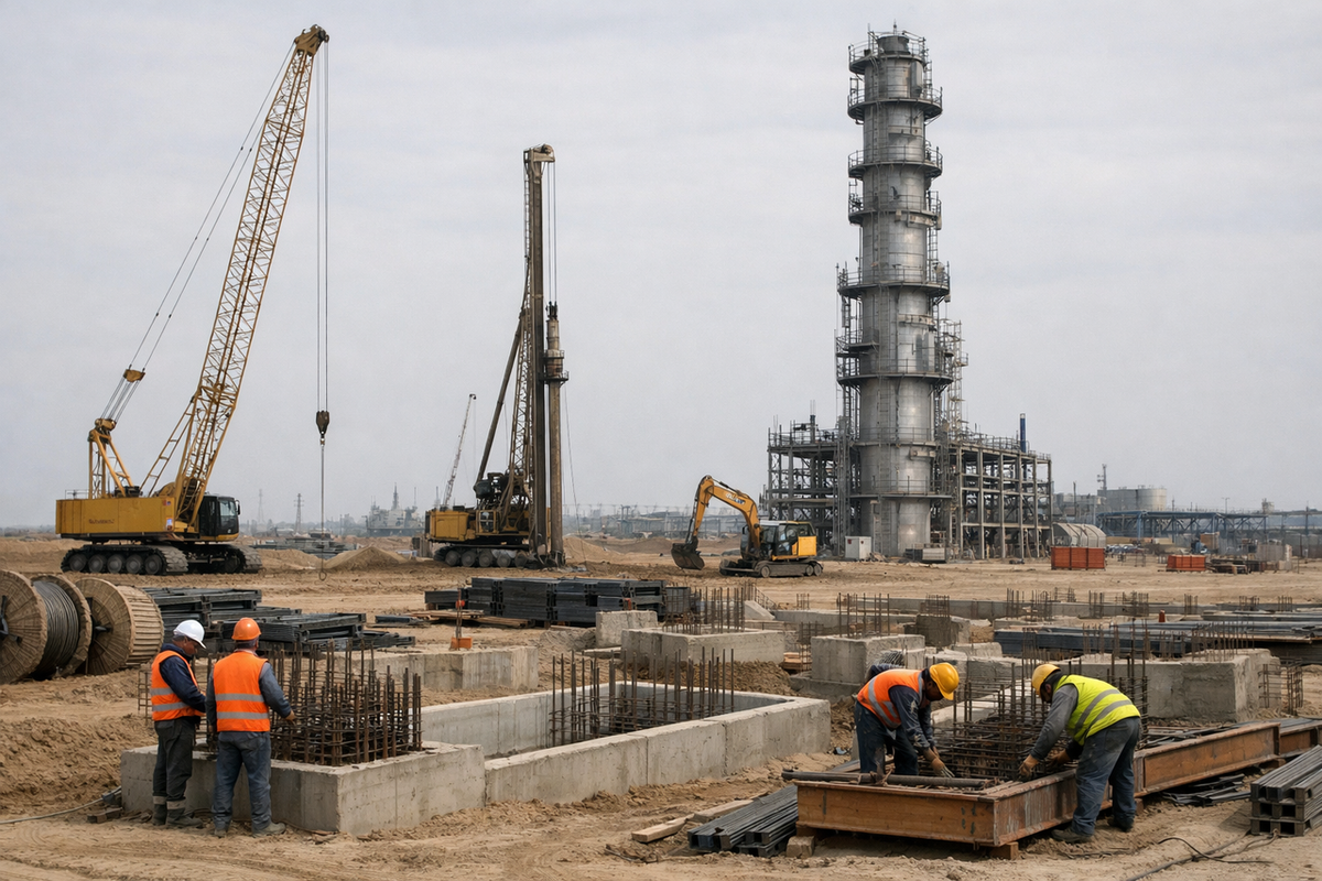 На участке второй ключевой установки — полимеризации — и объектах общезаводского хозяйства выполнено 427 тысяч кубометров земляных работ. Для понимания масштаба: это эквивалент примерно 170 олимпийских бассейнов по объему вынутого грунта. Забито 3 721 свая, что формирует основу под тяжелые реакторы, компрессоры и складские комплексы. Это не символический строительный процесс, а инфраструктурная операция, сравнимая по сложности с созданием крупного нефтеперерабатывающего завода.