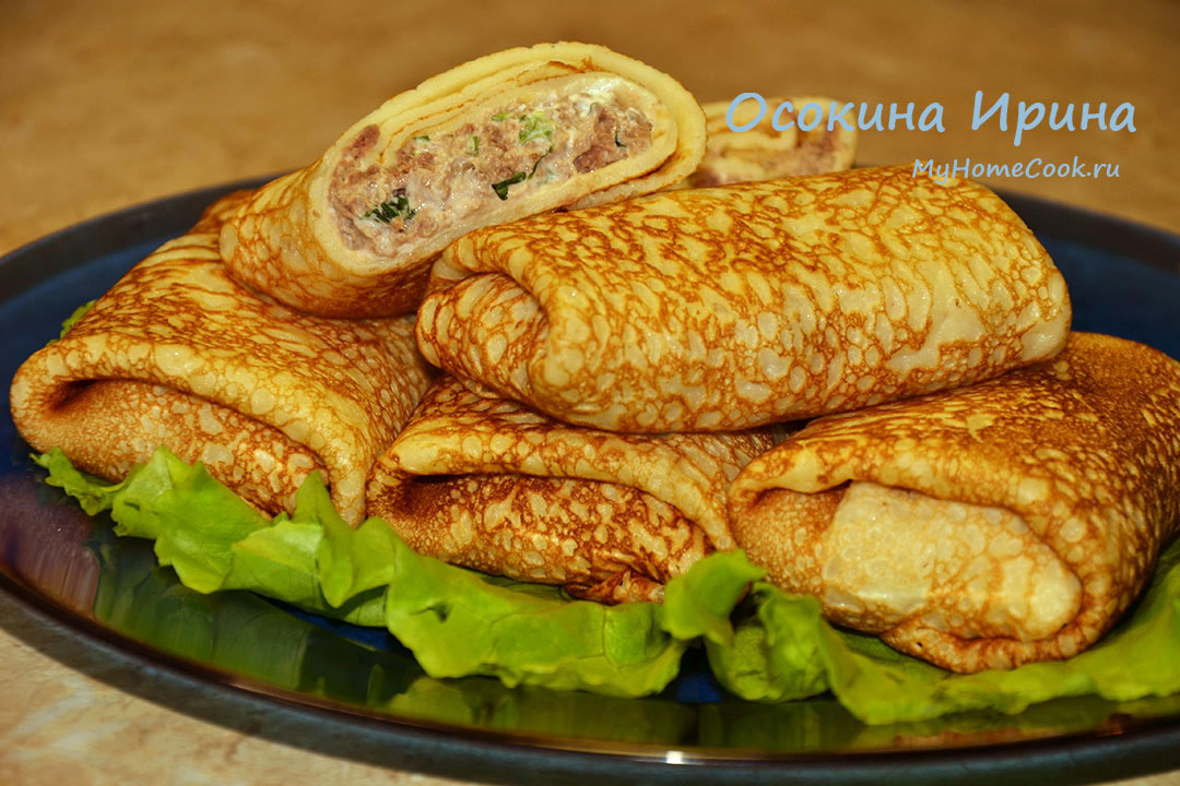 Для начинки в миске смешала 3 ст.л. творожного сыра и 4 ст.л. сметаны и промешала венчиком до однородности. Пропустила через мясорубку 200 г отварной говядины, добавила в миску, затем добавила горсточку резаной петрушки и промешала всё. В каждый блинчик добавляла 1 ст.л. начинки, сворачивала блин конвертиком и быстро обжаривала только чтобы подогреть начинку. Блины подойдут любые несладкие, у меня такие: в миску вбила 3 яйца, добавила 2 ст.л. сахара и 1/2 ч.л. соли и подвзбила, добавила 600 мл тёплой воды, промешала, затем добавила гашеную лимонным соком соду на кончике ножа и порциями, перемешивая венчиком, добавила 250 г просеянной муки, влила 2 ст.л. растительного масла и окончательно вымешала - получилось тесто консистенции жидкой сметаны, после чего напекла блинов обычным способом на чугунной блинной сковороде. Вкусно и сытно) Приятного аппетита