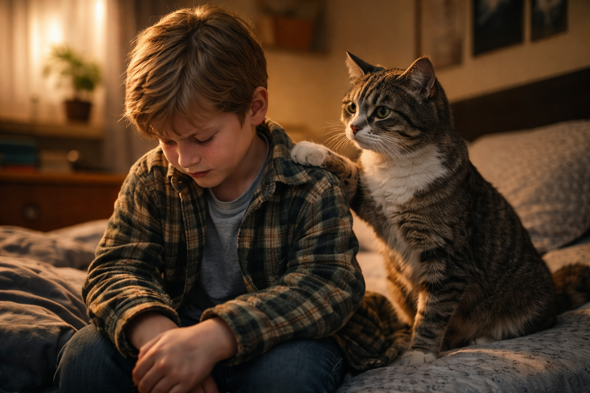 А для мальчика, которого высмеяли, слово «я вижу» иногда важнее любой правильной взрослой фразы. Потому что взрослые часто говорят много, но не всегда замечают. А кот замечает тихо. И остаётся рядом так, как умеет: лапой на плече, теплом на боку, мурчанием в темноте.