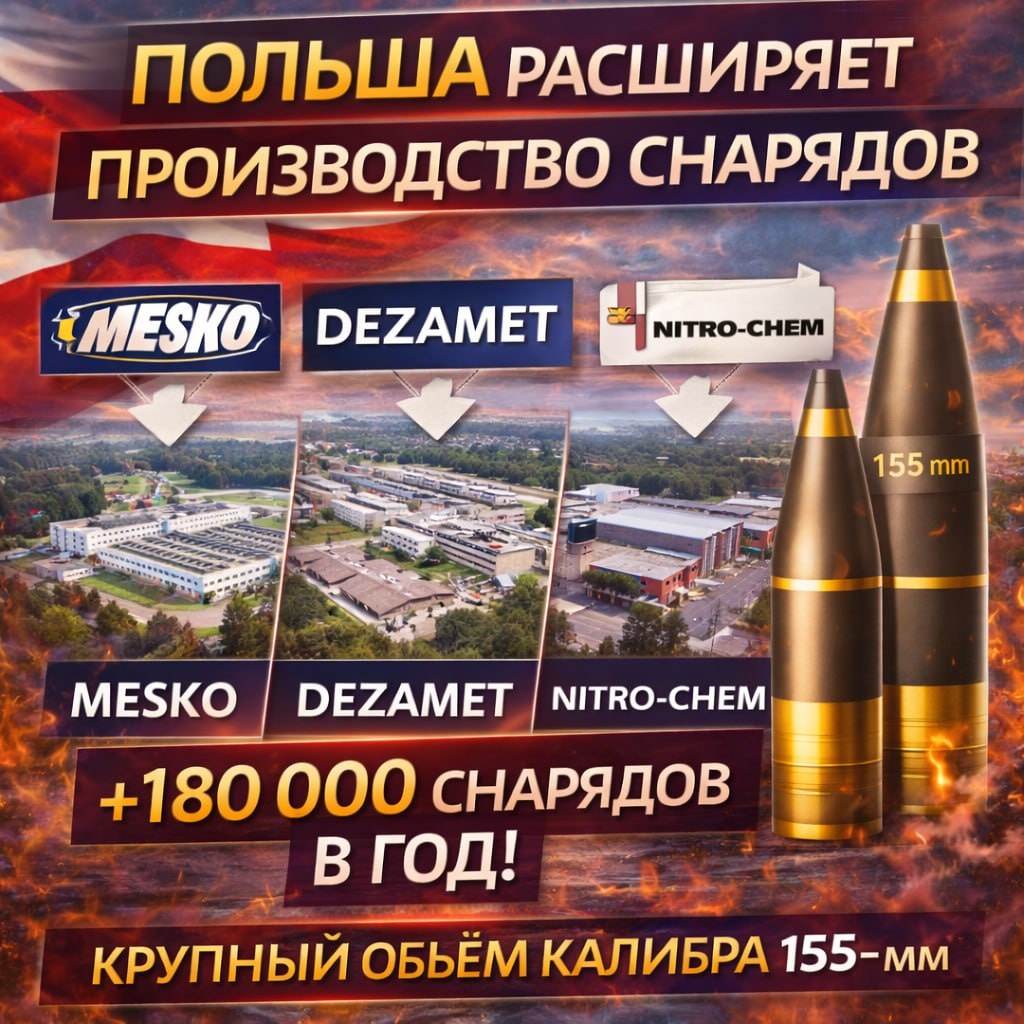 Речь идёт не об одном заводе, а о формировании полноценного промышленного кластера, в котором ключевую роль играет госхолдинг Польская группа вооружений (Polska Grupa Zbrojeniowa, PGZ), значительно превосходящий частные инициативы по масштабу и инфраструктуре. Государственный блок PGZ реализует программу трёх крупных центров производства крупнокалиберных снарядов. Базовый ориентир к 2027–2028 годам составляет 180 тыс. 155-мм выстрелов ежегодно только по линиям холдинга: 1. В Крашнике на базе MESKO создаётся крупнейший в стране центр по производству корпусов 155-мм снарядов с целевой мощностью до 150–180 тысяч корпусов в год. MESKO обеспечивает практически полный цикл — от изготовления корпуса до снаряжения и испытаний. 2. Завод DEZAMET в Нова-Дембе сохраняет статус исторического производителя 155-мм боеприпасов для САУ Krab и расширяет мощности при участии BAE Systems. 3. Предприятия Nitro-Chem и Gamrat в контуре PGZ отвечают за производство взрывчатых веществ и метательных зарядов,