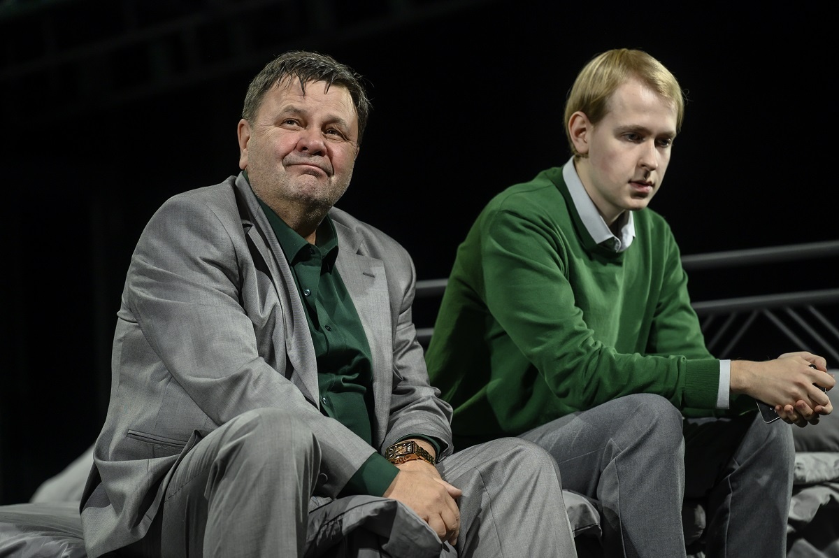 Сразу напишу, что как и в предыдущих увиденных мной спектаклях ("Улитка на склоне", "Мария Стюарт" и "Борис Годунов") на сцене присутствует ванна, и, соответственно, будет сцена помывки действующих лиц. Также все эти спектакли объединяет то, что сделаны они на стыке жанров театра и кино, все происходящее снимается на камеру и крупным планом транслируется на экран. Тут замечу, что с моей любимой галерки (в театр хожу часто и по этой причине беру недорогие места) экран видно не полностью ввиду устройства сцены в МХТ (в МТЮЗ и театре Наций и с балкона было хорошо видно экран).