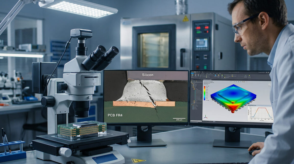 Коэффициент термического расширения платы обычно лежит в пределах четырнадцати-восемнадцати частей на миллион на градус. У кремния он около трех. Разница в десять-пятнадцать единиц при перепаде в восемьдесят градусов создает сдвиговую деформацию до одного процента за цикл. Для припоя это уже заметная нагрузка. Особенно страдают соединения на краю корпуса где расстояние от центра платы максимальное. Здесь рычаг больше и напряжения растут пропорционально.