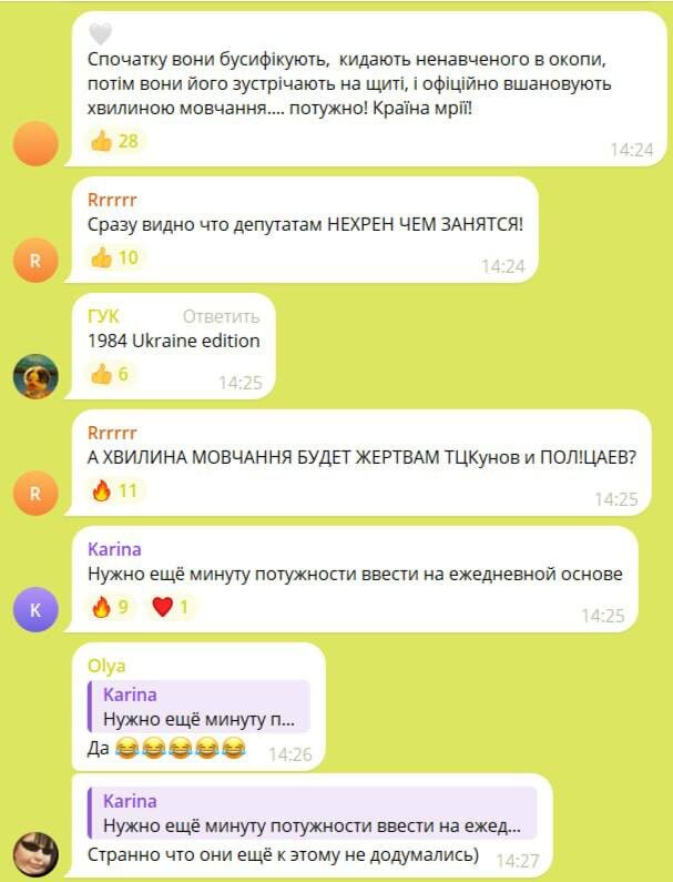 «За» проголосовало 260 депутатов. Законопроект №14144 официально разрешает городам и общинам использовать национальную систему оповещения для объявления минуты молчания в память о погибших ежедневно в 9:00. После этого депутаты разбежались и обсираются у себя дома, а в стране наступил настоящий дурдом. Все машины останавливаются на минуту на дороге, даже в операционных врачи прекращают операцию и скорбно молчат. Комментарии украинцев под новостью о законе соответствующие. Теперь осталось только принять закон о «пятиминутке ненависти» к «москалям».