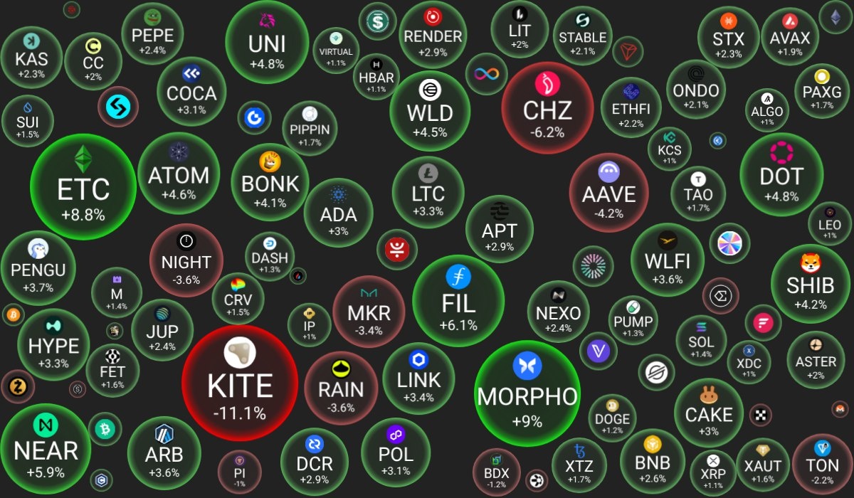 🗓 21.02.2026 09:30 по Москве. 🔗 Посмотреть на сайте 📈 Лидеры роста (из ТОП-100): 🟢 Morpho (MORPHO): $1.5780 (+9%) 🟢 Ethereum Classic (ETC): $9.0144 (+8.8%) 🟢 Filecoin (FIL): $0.9773 (+6.1%) 📉 Лидеры падения (из ТОП-100): 🔴 Kite (KITE): $0.2390 (-11.1%) 🔴 Chiliz (CHZ): $0.0362 (-6.2%) 🔴 Aave (AAVE): $119 (-4.2%) 🔍 Основные метрики: 🟢 Общая капитализация: $2330.24 млрд (+0.50%) 🟢 Общий объем торгов: $97.89 млрд (+22.28%) 🔴 Доминация Bitcoin: 58.23% (-0.18%) 🔴 Доминация Ethereum: 10.17% (-0.00%) 🟢 Индекс страха и жадности: 8 / 100: ЭКСТРЕМАЛЬНЫЙ СТРАХ (+1) 🟢 Индекс Альтсезона: 34 / 100: НЕ АЛЬТКОИН-СЕЗОН (+1) 📖 Интересно почитать: 👉 Подборка сервисов для полного технического анализа на рынке криптовалют в 2025 году. 😻 Наши сервисы и бонусы: 👥 VK - наша группа в VK 📈 Bitget - Скидка на торговую комиссию 20% + бонус до 200$