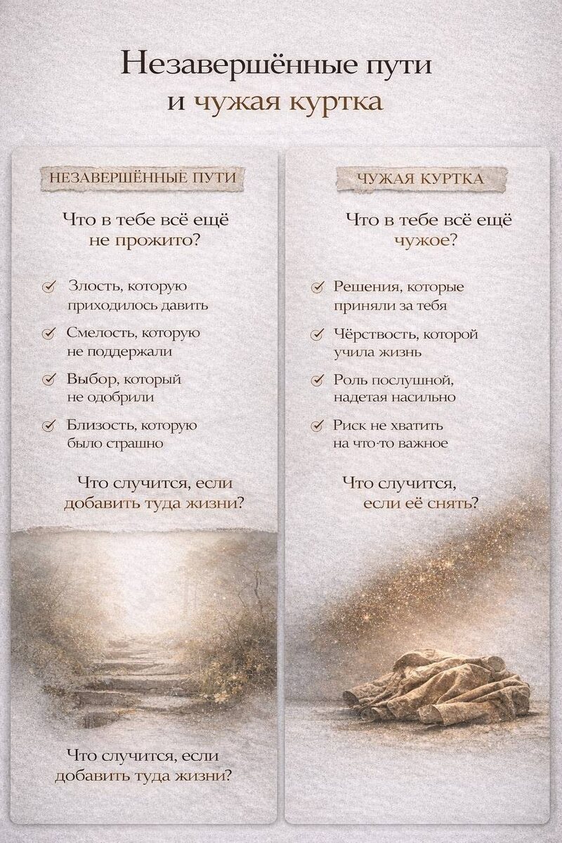 Директива останется в теле. Она будет включаться: в конфликте в близости в деньгах в выборе Ты можешь всё понимать — и продолжать жить в старом напряжении. Вопрос честный: ты правда хочешь дальше носить эту «чужую куртку»?