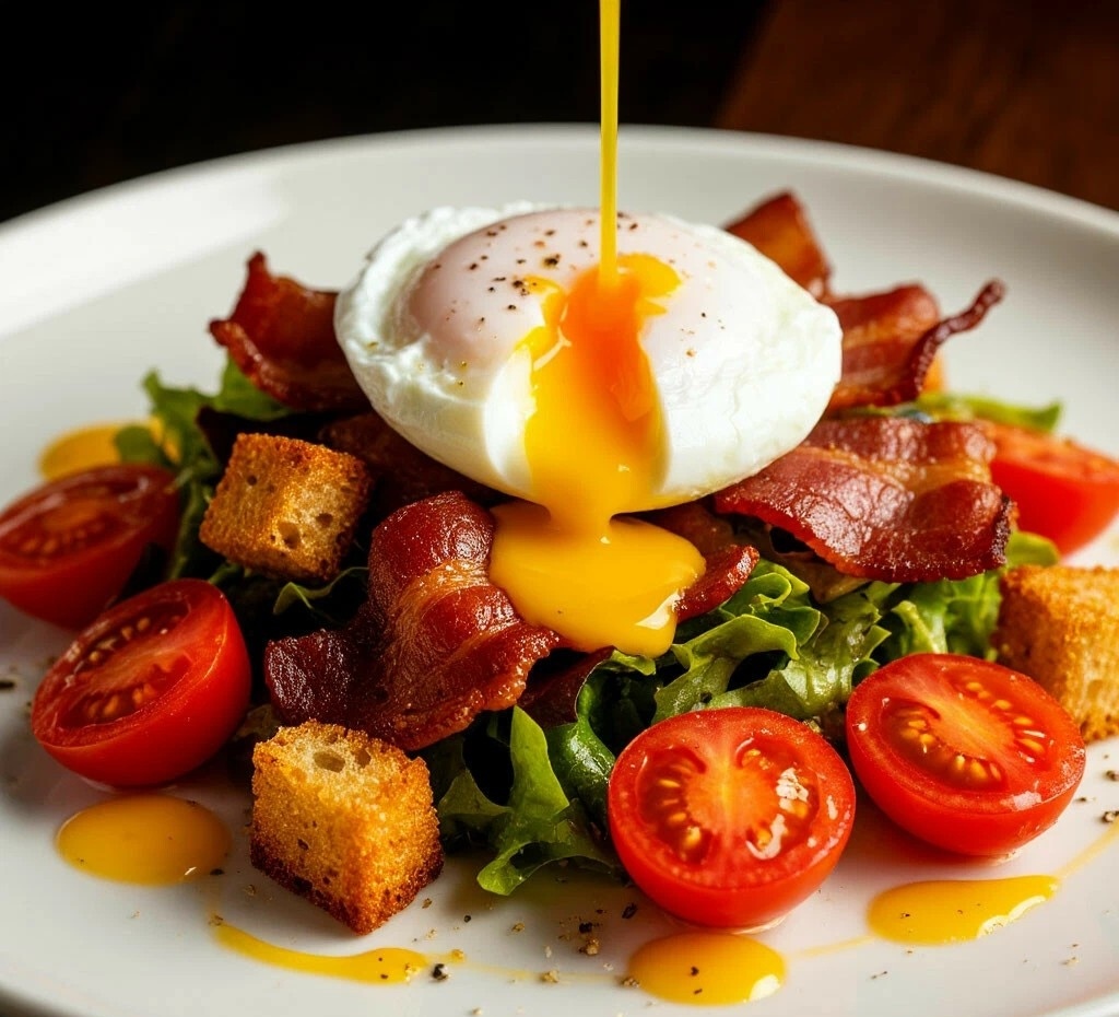 Мяу, мои любители хрустящего и сочного! 😼🥗 Этот салат — настоящий ресторанный хит, который собирается за 15 минут. Хрустящий бекон, нежное яйцо пашот, свежий салатный микс и пикантная горчичная заправка. Идеально для лёгкого обеда или ужина!