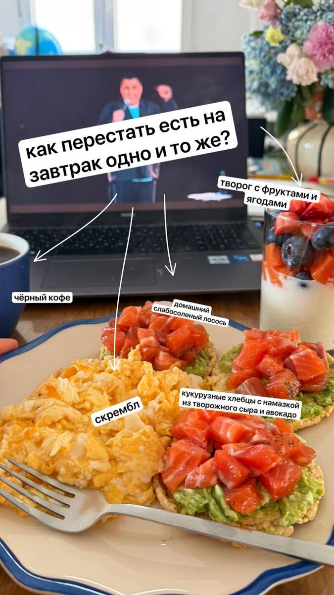 ? Я просто очень хочу поделиться, вдруг вам будет так же вкусно и сытно, как мне 😊 Я люблю готовить от холодного к горячему, чтобы, когда я сажусь есть, скрембл на тарелке и кофе в чашке были ещё не остывшими. И как обычно: я не знаю, сколько тут ккал (предположительно - много) и сколько чего в граммах 😃Итак. 1. Творог в стакане с ягодами и фруктами Я беру мягкий творог 200 г и засыпаю его ягодами и фруктами. Всё 😂 Без сиропов и топпингов, без варенья или ещё чего-то, а получается супер вкусно. Для меня это в качестве десерта. 2. Скрембл с хлебцами Я подсела на кукурузные хлебцы. Беру 3 штуки, на них намазываю заранее помятый в тарелочке авокадо, чуть-чуть вперемешку с творожным сыром. Сверху щедро, очень щедро наваливаю слабосолёный лосось (солю сама), и откладываю это в сторонку. В последнюю очередь жарю скрембл. Жарю на сковороде без масла: яйца плюс белки (у нас продаются отдельно в бутылочках). Добавляю соль и красный перец для вкуса. Я люблю, когда скрембл чуть-чуть мо