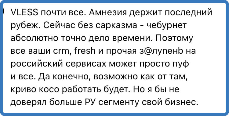 Я не согласен, но постепенно прихожу к мнению, что через 2-3 года надо максимально абстрагироваться от любых западных сервисов, как бы это