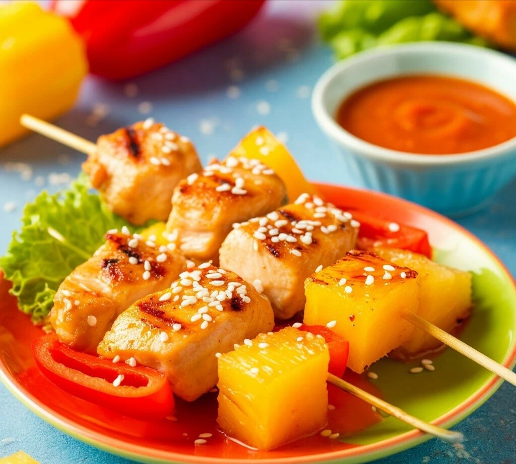 Мяу, мои маленькие поварята и их родители! 😸🍍 Сегодня мы делаем мини-шашлычки, которые можно собрать и пожарить за 15 минут! Курица, ананас и сладкий перец на шпажках — это вкусно, весело и очень нравится детям. А мама рада — быстро и полезно!