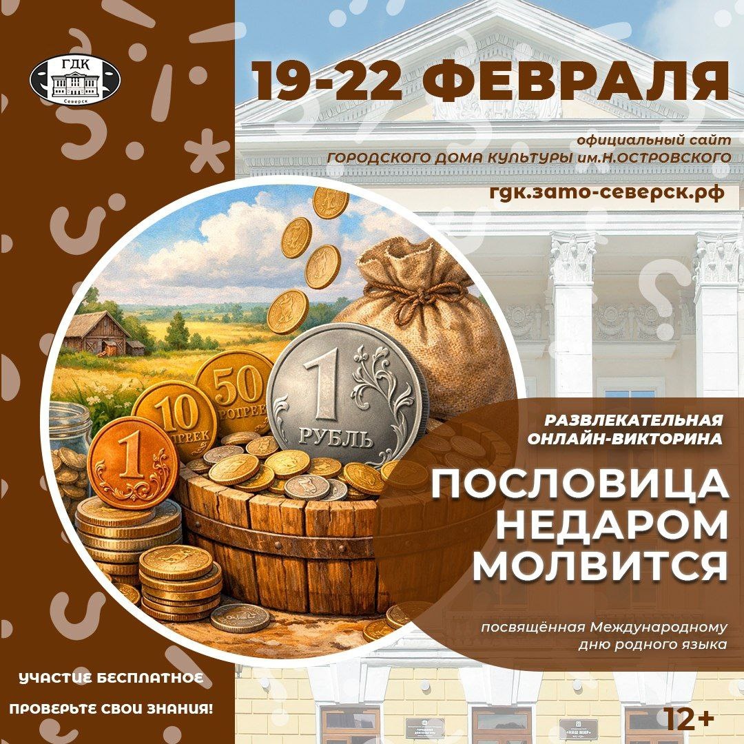 Международный день родного языка отмечается ежегодно 21 февраля. Дом культуры подготовил онлайн-викторину «Пословица недаром молвится». Вас ждут самые известные русские пословицы и поговорки, а также мудрые высказывания других народов России. Многие из них знакомы нам с детства, хотя мы могли и не слышать их в повседневной речи. Присоединяйтесь к викторине на сайте гдк.зато-северск.рф/razvlekatelnaja-onlajn-viktorina-poslovitsa-nedarom-molvitsja