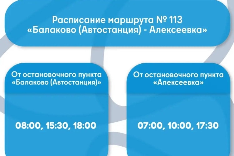 С 20 февраля 2026 года по межмуниципальному автобусному маршруту регулярных перевозок пригородного сообщения №113 «Балаково (Автостанция) — Алексеевка» вводятся дополнительные рейсы. Введение дополнительных рейсов направлено на повышение транспортной доступности и удобства пассажиров. Движение автобусов будет осуществляться ежедневно по обновлённому расписанию. Отправление от остановочного пункта «Балаково (Автостанция)»: 08:00 15:30 18:00 (дополнительный рейс) Отправление от остановочного пункта «Алексеевка»: 07:00 (дополнительный рейс) 10:00 17:30