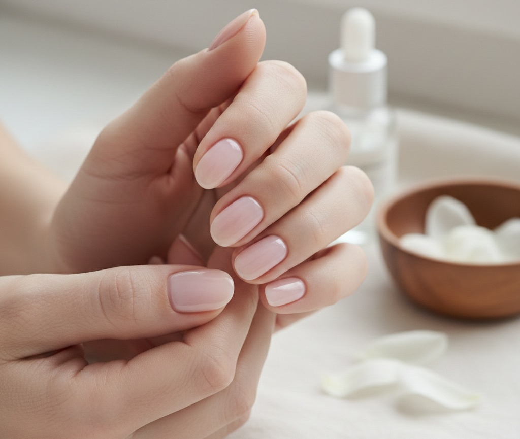 Самый громкий тренд — маникюр, который выглядит как здоровая, неухоженная пластина. Речь о полупрозрачных нюдовых покрытиях — «молочные ванны» (milk bath nails) и «мыльные ногти». Безупречная кутикула, легкий блеск, едва уловимый розоватый оттенок.