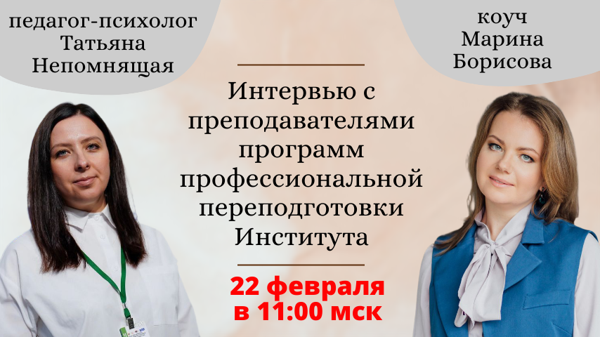 2 марта у нас стартуют программы профессиональной переподготовки по двум направлениям – «педагог-психолог» и «коуч родителей, детей и подростков». В преддверии этих программ мы приглашаем вас поближе познакомиться с основными их преподавателями – Татьяной Непомнящей и Мариной Борисовой. Знакомство – в формате живого интервью! Татьяна и Марина расскажут подробнее о своих профессиях, о практических занятиях на программах и о тех результатах, которые получат студенты во время обучения. Завтра, 22 февраля, в 11:00мск будем рады вас видеть на интервью по ссылке: https://us06web.zoom.us/j/89916826875?pwd=xTrFwKVOdjfuHhPK6FoOMp8hHOMDag.1 Идентификатор конференции: 899 1682 6875 Код доступа: 301860