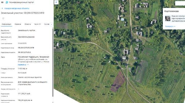 Название: Земельный участок из земель населенных пунктов с кадастровым номером 58:28:0270202:819, общей площадью 1473 кв.м., с видом