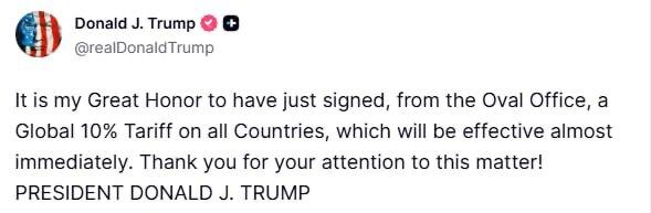 Трамп подписал в Овальном кабинете указ о введении глобального 10%-го тарифа на товары из всех стран