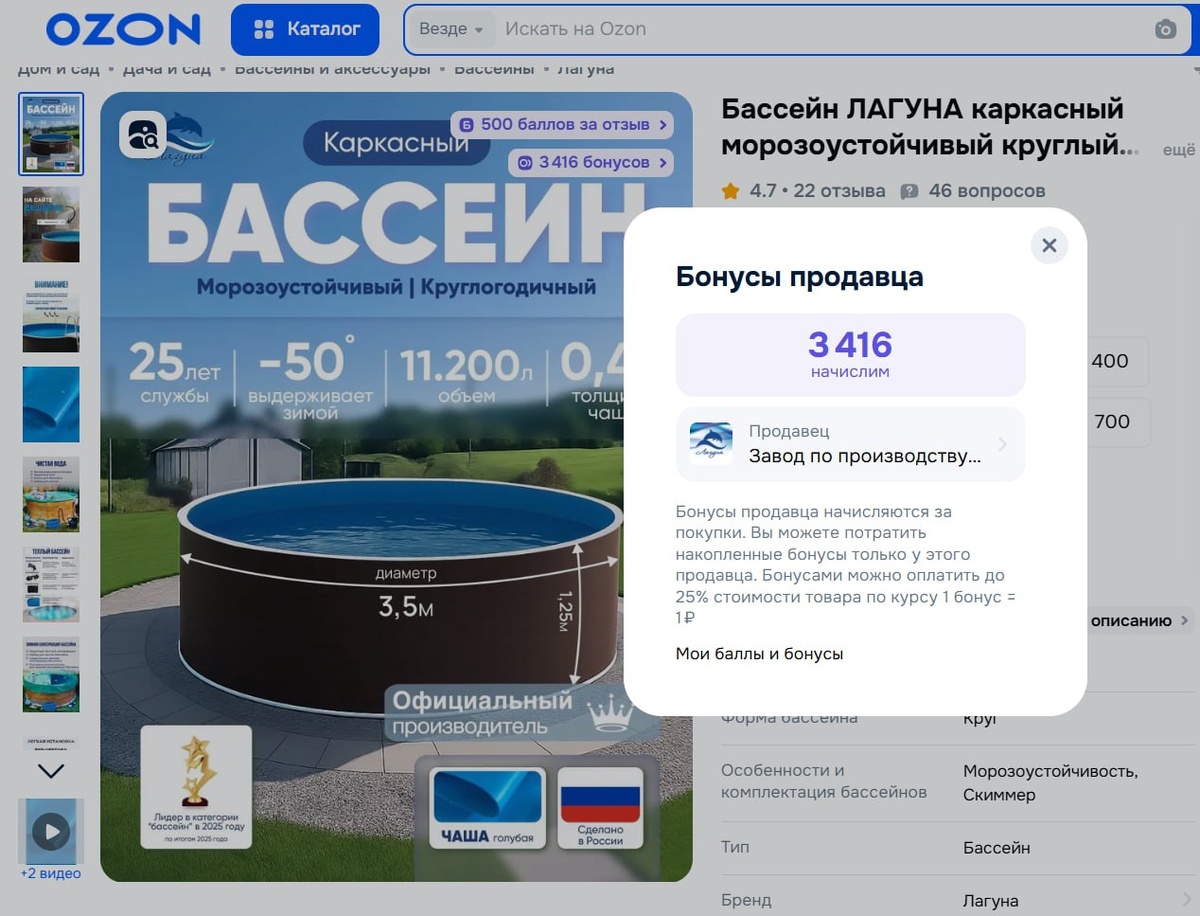предоставляем бонусные баллы Ozon, которые можно тратить на любые покупки. Купить морозоустойчивый бассейн по лучшей цене: https://www.ozon.ru/product/basseyn-laguna-karkasnyy-morozoustoychivyy-kruglyy-diametrom-3-66-m-temnyy-shokolad-chashkovyy-3528726036/?from_sku=1544060352&oos_search=false