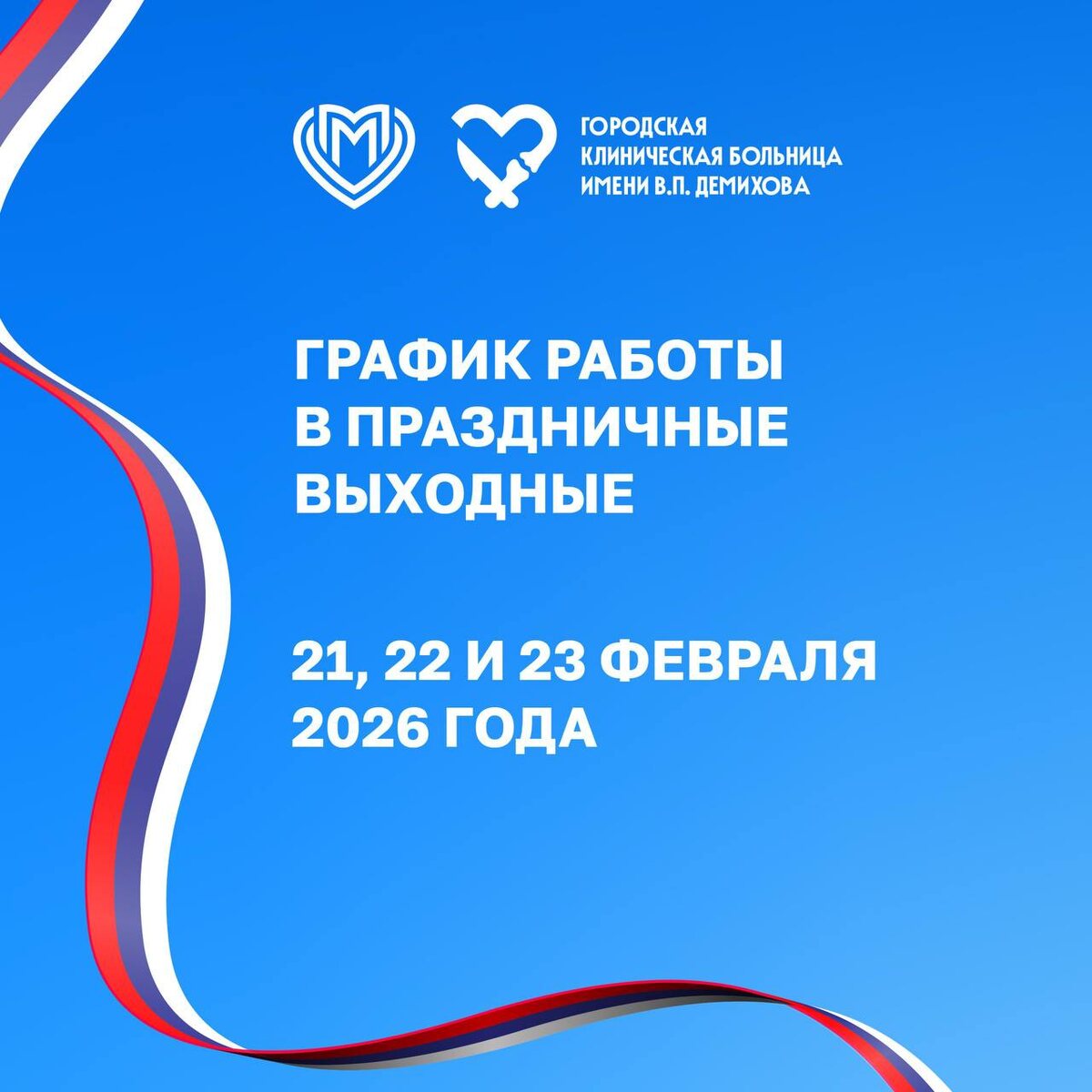 с 21 февраля 2026 г. по 23 февраля 2026 г. 🇷🇺21 февраля 2026 года – по графику субботы 🇷🇺22 февраля 2026 года – по графику воскресенья 🇷🇺23 февраля 2026 года - по графику праздничного дежурства 🏪Стационарная помощь — КРУГЛОСУТОЧНАЯ; ℹ️ Контакт–центр Справочная служба (узнать о состоянии больного, получить информацию о работе стационара): ☎️+7(495)870-55-33 (круглосуточно); ℹ️ Патологоанатомическое отделение 🔴22 февраля 2026 года - рабочий день с 9:00 до 14:00 часов; 🔴21 и 23 февраля 2026 года - нерабочие дни. 🏪С 24 февраля 2026 года все подразделения работают в обычном режиме #дзм #гкбдемихова #режимработы