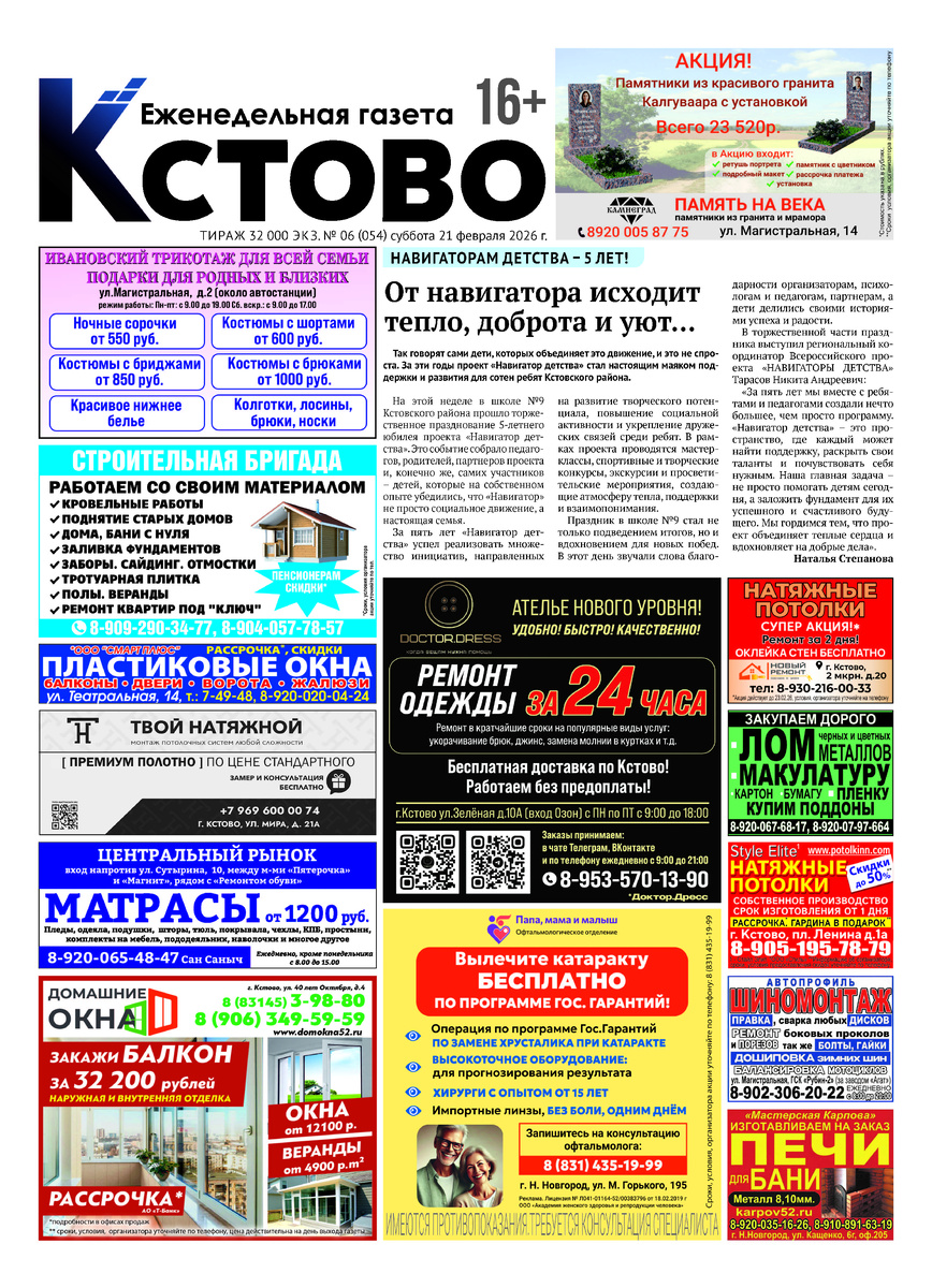 Газета "Кстово" № 54 от 21.02.2026 г.