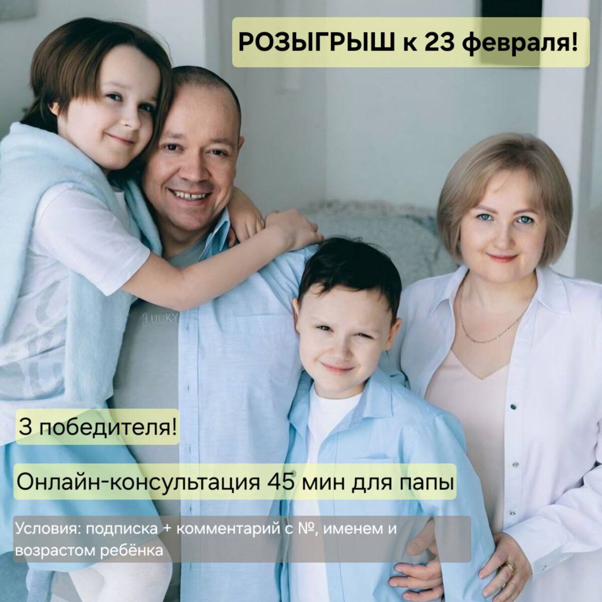 ! 🎁 Дорогие мамы! 🙂 В честь 23 Февраля, День наших защитников, хочу поддержать пап и разыграть полезный подарок — онлайн-консультацию для папы длительностью 45 минут со мной, экспертом по осознанному родительству и детским психологом. 🤗 Быть папой — это не только ответственность, но и множество вопросов: как лучше понимать своего ребёнка, как выстраивать тёплые отношения и какую роль папа играет в развитии малыша. На консультации можно будет разобрать именно вашу ситуацию и получить практические рекомендации. ❗️Мамы, обязательно участвуйте — чтобы подарить консультацию папе своего ребёнка к празднику! 🥰 🎉 Будет выбрано 3 победителя. Что получат победители: ✨ Индивидуальную онлайн-консультацию (45 минут)* ✨ Ответы на вопросы о воспитании и развитии ребёнка ✨ Практические советы для папы Условия участия: 1️⃣ Быть подписанным на канал 2️⃣ Написать в комментариях: • порядковый номер • возраст ребёнка или детей Например: 1 Сын 2 года 📅 Итоги подведу 23 февраля в 16 часов с помо