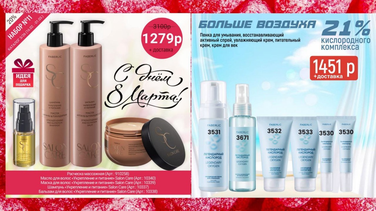 Состав наборов ⬇️ 🤝🤝🤝🤝🤝 1️⃣ ⬇️ Парфюмерная вода для женщин Alatau Wings, 50 мл (Арт.: 3128) ⬇️Антивозрастной кислородный шампунь Oxy Hair (Арт.: 10310) ⬇️Кислородная пенка для умывания «Легендарный кислород» (Арт.: 3531) ⬇️Многофункциональный кислородный бальзам «Легендарный кислород» (Арт.: 3529) ⬇️Восстанавливающий активный спрей «Легендарный кислород» (Арт.: 3671) ⬇️Гидрогелевые патчи для кожи вокруг глаз «Кислородное увлажнение» Oxiology (Арт.: 3669) ⬇️Крем-гель для кожи вокруг глаз «Кислородное увлажнение» Oxiology (Арт.: 3717) ССЫЛКА НА ГОТОВЫЙ НАБОР ⬇️ https://faberlic.com/index.php?option=com_catalog&view=cart&lang=ru&sponsornumber=ВАШ_НОМЕР&cart=1001469417883%3A1%3B1001539448818%3A1%3B1001659102216%3A1%3B1001660751922%3A1%3B1001543574396%3A1%3B1001546105760%3A1%3B1001482861977%3A1 🤝🤝🤝🤝🤝 2️⃣ ⬇️Масло для волос «Укрепление и питание» Salon Care (Арт.: 10340) ⬇️Маска для волос «Укрепление и питание» Salon Care (Арт.: 10339) ⬇️Шампунь «Укрепление и питание» S