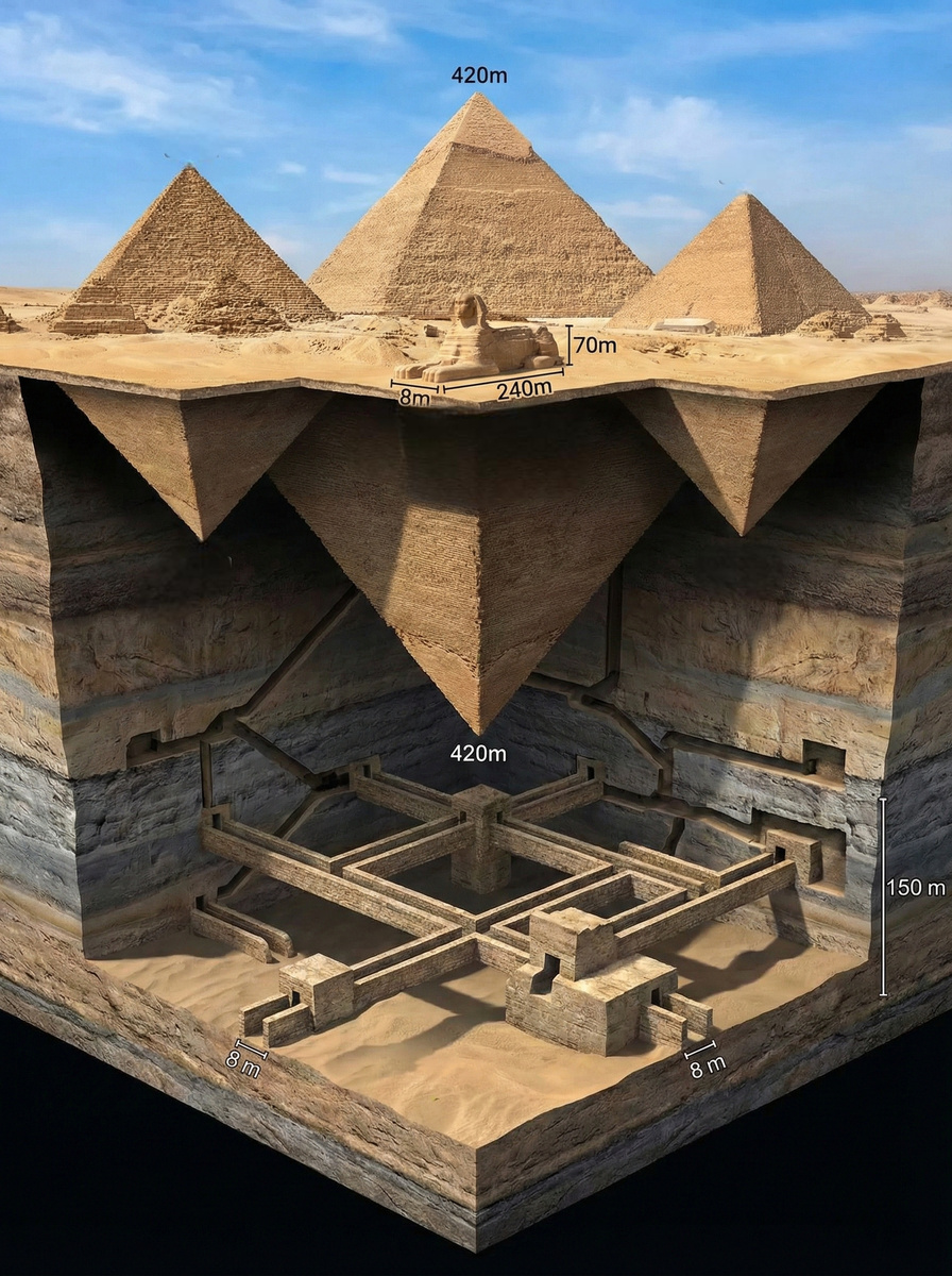 Это не 146 метров вниз. Но это — прецедент: под плато рядом с пирамидами есть скрытые объекты, которые не видны глазом и явно строились руками.