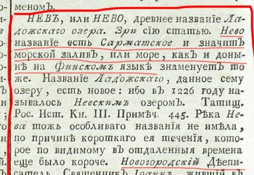 Еще раз. На момент главной катастрофы в первой половине 13 века скорее всего не было Ладоги, как минимум такой большой. Была река Тосна которая текла через Пра-Питер и в районе Кронштадта формировала дельту из двух рукавов, в обход Кронштадта. Невской губы не было, берег моря был западнее Кронштадта, там сейчас свал в глубину. Там, где сейчас Кронштадт, уровень земли был выше современного примерно на 6-8 метров, а в районе Петропавловской крепости Санкт-Петербурга еще на 3-4 метра выше. В главную катастрофу эта часть суши опустилась и осталась под водой, затопив древний Пра-Питер. Образовалась Ладога, непонятной формы и размеров, и она была частью Балтики, морским заливом. Собственно старое название Ладоги (до конца 18 века) было Нево, что означает морской залив. Об этом еще писали справочники 19 века. Вот скрин из справочника 1805 года, с отсылкой к Татищеву.