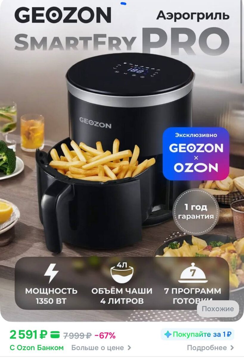 GEOZON SmartFry Pro Аэрогриль, 4 л, 7 программ, черный