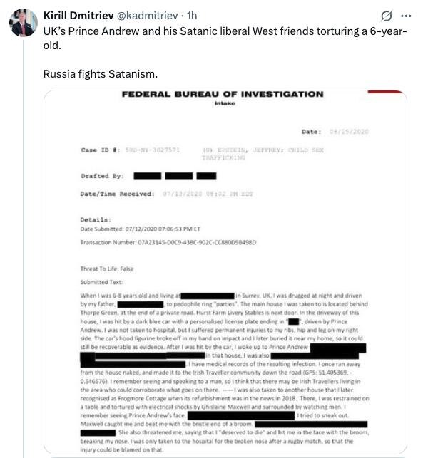 "Британский принц Эндрю и его сатанинские либеральные западные друзья истязают 6-летнего ребенка. Россия борется с сатанизмом", - написал Дмитриев в соцсети Х. Дмитриев приложил файл из дела Эпштейна, в котором описывается, как сообщница финансиста Гислейн Максвелл пытала 6-летнего ребенка электрическим током. В этом документе также упоминается британский экс-принц Эндрю. 🔴 Читайте Sputnik Беларусь в MAX