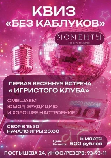 » Смешаем юмор, эрудицию, музыку, танцы, новые знакомства и море положительных эмоции. Вас ждут весёлые раунды с заданиями, антракты с игристым, церемония награждения с призами от партнёров, ведущий, фотограф. Создавайте команду от 2-х человек, придумывайте классное название, берите билеты и готовьтесь к увлекательному путешествию 📅 Когда: #5_марта 20:00 ⛳ Где: гастро-бистро Моменты, Постышева 24 💳 Стоимость: 600₽/персона 📞 Бронирование: 93-93-11 👉 Афиша Хабаровска. Куда сходить, экскурсии