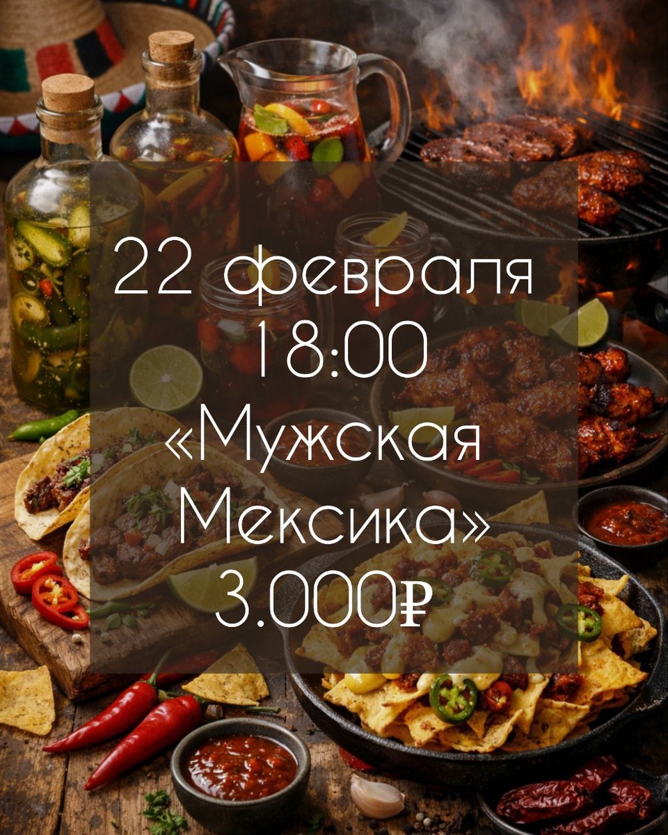 🔥 Мужская Мексика с шефом Артуром Подрезовым 🇲🇽🍺 Готовим. Едим. Пьем сангрию Никаких салатиков — только мясо, жар, дым и острота! Под руководством шефа Артура Подрезова ты за 2 часа: 🌮 соберёшь сочные тако с карне асада, 🧀 зальёшь сыром начос с чоризо, 🔥 обжаришь легендарные крылья в соусе чипотле. Бонус для мужчин: каждый приготовит свою собственную крафтовую настойку с «Отцом настоятелем)» https://вкуснеенет.рф 🚫 Возраст: 18+ 📆 22.02.2026 🕛 18:00 🏢 Кулинарное пространство «Вкуснеенет» 📍 г. Подольск, ул. Генерала Стрельбицкого, 3 💰 Цена: 3000 ₽ 🔗 Напишите нам: https://t.me/vkusneenett ⭐Поддержать канал голосом 🍰Где поесть в Подольске ✅ Мероприятия Подольск https://dzen.ru/id/66ed500f7b5671493eca3fd6 http://vk.com/podolsk_events http://dzen.ru/podolsk_events
