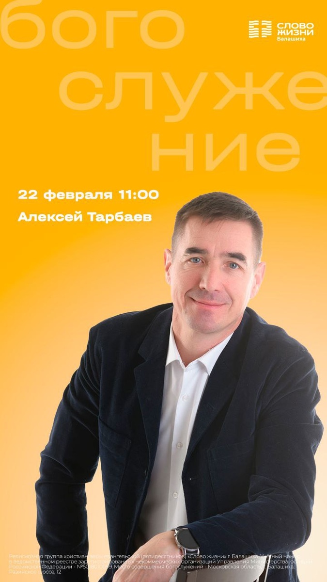 В воскресенье, 22 февраля, на богослужении проповедует пастор Алексей Тарбаев. Начало в 11:00.