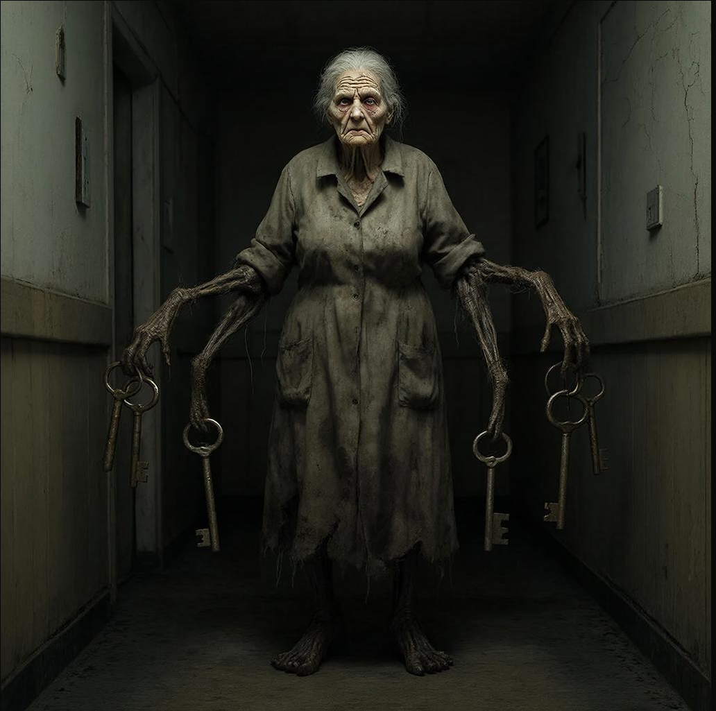 Она сделала ещё шаг, и из-под халата показались пальцы. Длинные, тонкие, и на концах их не было ногтей — там были ключи. Старые, ржавые ключи для открывания лифтовых дверей, с круглыми головками и длинными бородками.