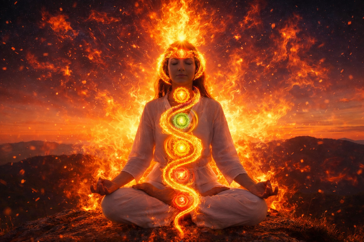 В ряде эзотерических традиций образ «Огня Кундалини» описывается как «Энергия огня», возгорание Огня, Энергия Огня Кундалини, как процесс, который начинается в районе матки/простаты, т.е. под копчиком и поднимается вверх по внутренней стороне крестца до поясницы, а далее, уже от этого «Огня», вверх поднимается раскалённый «воз-дух» и он входит в Мозг… «Энергия Огня Кундалини (обзор от ИИ) – это дремлющая в основании позвоночника мощная творческая и духовная сила, символически свёрнутая … и подобна змее. Её называют «жидким огнём» или «жидким светом», способным при пробуждении вызывать трансформации, которые в традиции интерпретируются как необычные психофизические переживания. И эта пробуждённая сила поднимается вверх и описывается как вспышка молнии или метафорически описывается как процесс внутреннего очищения и трансформации. Это пробуждение может сопровождаться чувством жара, блаженства, сильными физическими ощущениями и видениями». Но, при проведении различных упражнений, приводящ