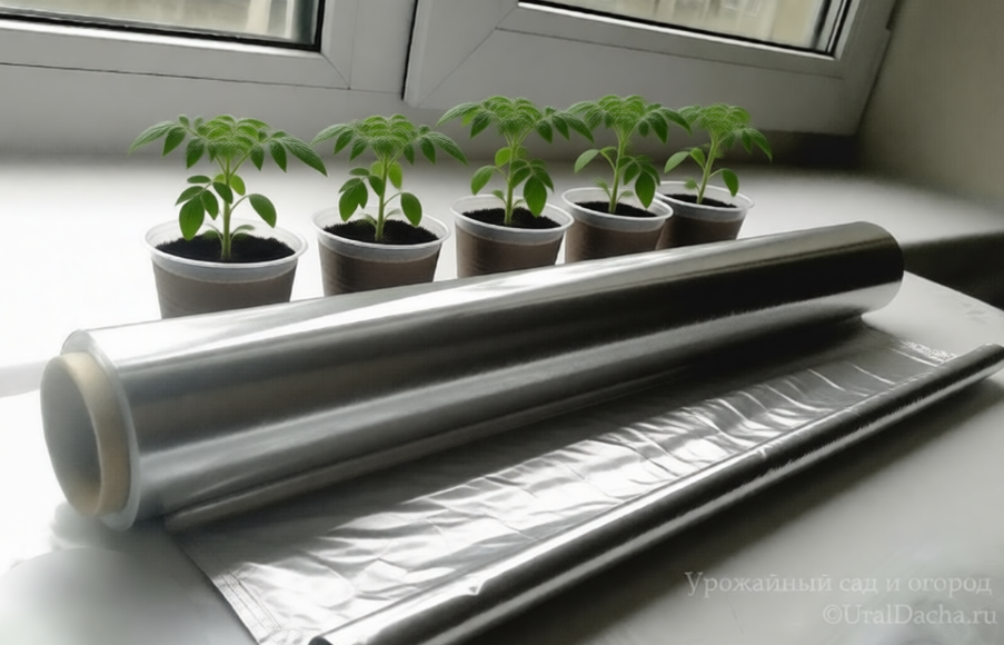За счет отражающей способности поверхности фольги солнечные лучи не пропадают зря, а «возвращаются» к растениям с боковых сторон и даже с тыльной части. В результате рассада лишается необходимости тянуться исключительно в одну сторону к окну.