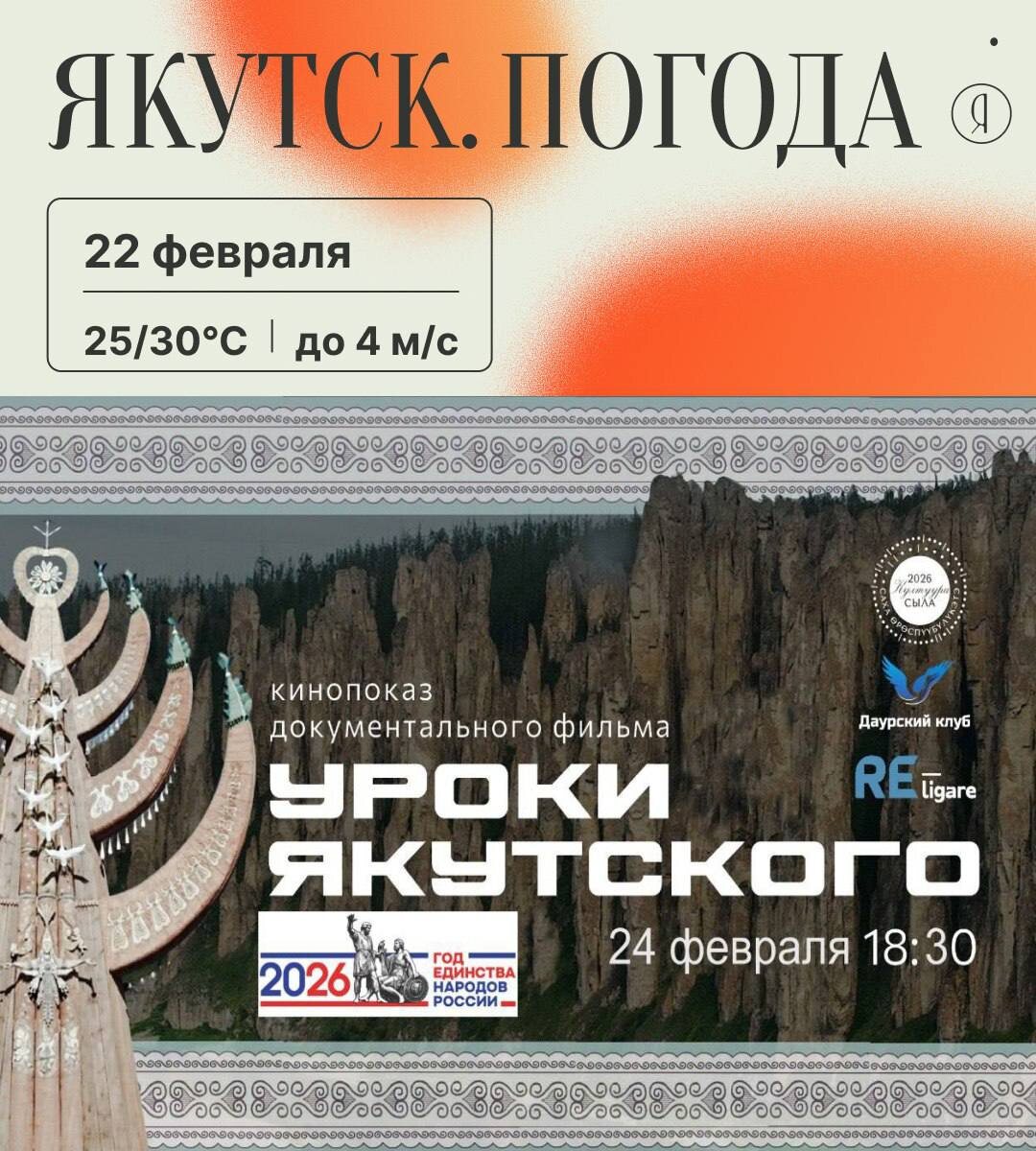В Москве состоится премьера фильма «Уроки якутского». Это разговор о том, как два языка уживаются в одной голове и в одной семье 💞 🎬 Картина отвечает на вопросы: Что такое культура многоязычия на практике? Как выглядит день человека, который мыслит и говорит на двух языках? Как родители решают, на каком языке и когда обращаться к детям? В фильме показаны те, кто прошел этот путь, включая самого автора, потомка переселенцев, для которого якутский стал родным. Какие слова перешли в русский из якутского? Зрители узнают, что многие привычные термины пришли к нам из глубины веков и кочевий и до сих пор живут в нашей речи. В обсуждении примут участие Сергей Головецкий, режиссер, Владимир Федоров, потомок государевых ямщиков, соавтор сценария. 📍Москва, Подсосенский переулок 21, стр. 1, Дом народов России (особняк Морозовых) 🗓️24 февраля в 18:00. Вход свободный. Online Якутия | Ждем вас в МАХ