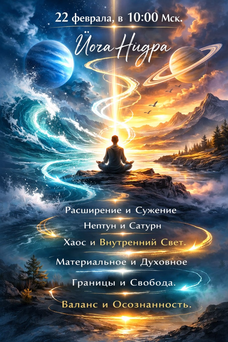 Нептун и Сатурн, две мощные силы, действующие на нас своей энергией, и запускающие мировые процессы. Устоять в этом хаосе и шторме, можно лишь имея негасимый внутренний Свет, зная этот Свет, держа его в поле своего восприятия, развернувшись к этому Свету. Где я сужаю свое восприятие, не вижу то, что для меня важно. Где я растекаюсь и не вижу своих границ, нарушая чужие. Каким образом материальная жизнь заместила духовное. А где духовное не дает место материи. Где мне можно быть в своей вертикали. Где мне нужно больше расширения и свободы. Например. Если человек болеет и ему нужен врач, а он только просит здоровья, молится, но ничего не делает, то что актуально сейчас? Или усиленно лечится, но не меняет свои привычки, свои устремленности и свое отношение к себе, близким, и миру, то что в этом случае актуально? Участие в практике онлайн (запись будет) - 800 руб. Оплата по номеру тел. 89037642214 или на сайте Йога-Нидра 22 февраля, 10:00 Мск. Элена Шанти Деви Мара (написать в личку