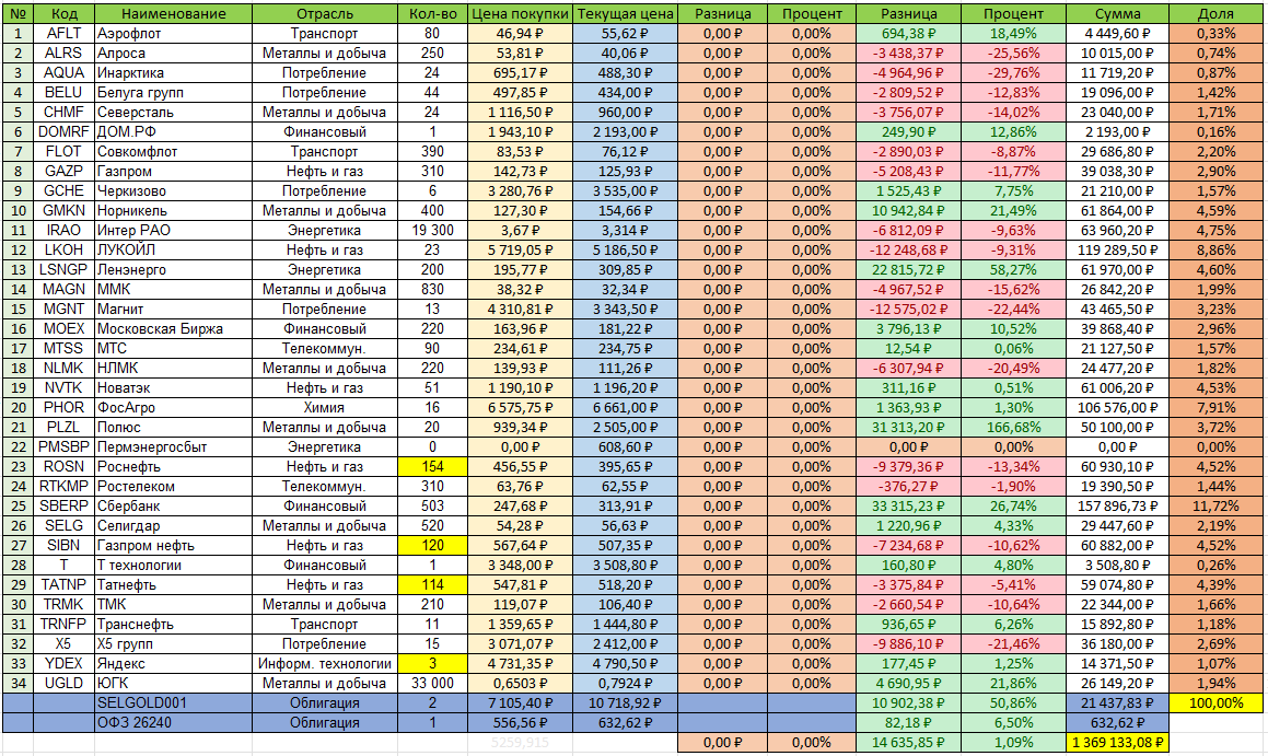 Но давайте перейдем уже к моим табличкам. И на первой можно увидеть все мои акции, их количество, среднюю цену, и т.д.