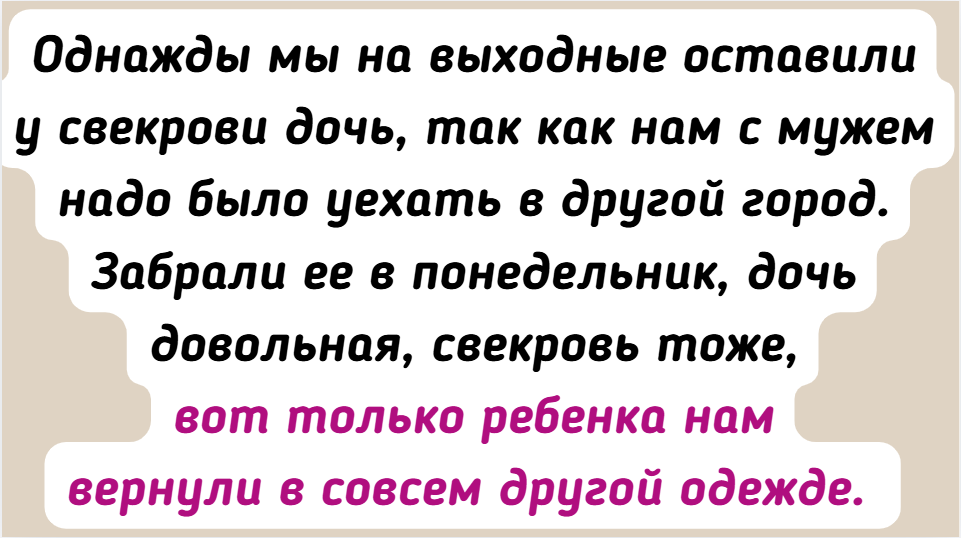 - Однажды мы на выходные оставили у свекрови дочь, так как нам с мужем надо было уехать в другой город. Забрали ее в понедельник, дочь довольная, свекровь тоже, вот только ребенка нам вернули в совсем другой одежде. Вместо нового комбинезона на ней была какая-то старая ветровка с дыркой на спине, какие-то старые штаны и странная шапка. В общем, история в том, что она гуляла на площадке, увидела какую-то старую знакомую. Потом привела ее к себе и отдала ей вещи нашего ребенка, потому что им нужнее. И ничего странного она в этом не увидела, им же действительно нужнее.