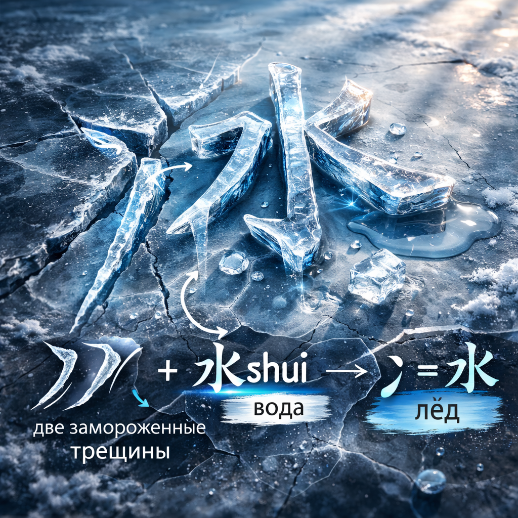 Вы когда-нибудь замечали, как две маленькие капли воды 💧💧 могут изменить смысл целого иероглифа? В китайском языке эти две капли не текут — они застыли. Это ключ 冫 (bīng) — самый морозный во всей иероглифической системе. 📜 История одного знака: от трещин ко льду Посмотрите на древнюю форму этого ключа — 仌 (bīng). Две линии, две трещины на замёрзшей поверхности. В словаре «Шо вэнь цзе цзы» (II век н.э.) говорится: «冫 — это замёрзшая вода, изображение того, как вода застывает» Позже рисунок упростили до двух точек, которые сейчас называют 两点水 (liǎng diǎn shuǐ) — «две капли воды». Только эти капли уже не текут. Это знак холода, остановки, превращения жидкости в твёрдость. И этот холод разлетелся осколками по самым разным словам — от мороженого до решимости. 🧊 1. 冰 (bīng) — Лёд; холодный; замораживать Состав: 冫 (лёд) + 水 (shuǐ — вода) 💡 Логика: Самый прямой и наглядный пример! Два ключа работают вместе: 冫 — это состояние, 水 — это материал. Вместе они дают нам 冰 — то, во что превра