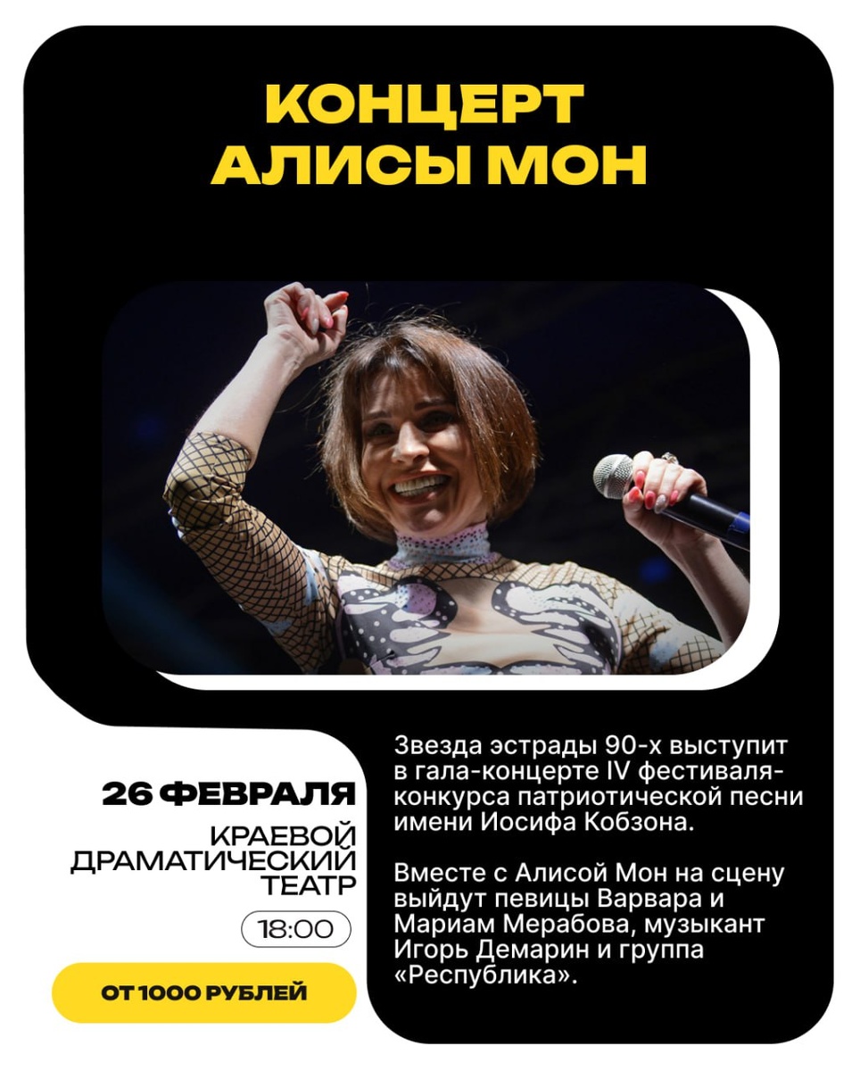 Её настоящее имя — Светлана Безух. Певица родилась в Иркутской области. В 1985 году ей предложили вступить в группу «Лабиринт», в которой вокалистка пела с 1986-го по 1989 годы. Параллельно с этим Алиса начала строить сольную карьеру. Хит «Алмаз», который покорил сотни тысяч слушателей по всей России, вышел в 1997 году. В наши дни певица активно участвует в телепроектах: «Маска» (16+), «Один в один» (16+) и других. Билеты можно купить в кассах и на сайте драмтеатра. 💬Фестиваль-конкурс патриотической песни имени Иосифа Кобзона проходит в Забайкалье в четвертый раз. В нем участвуют местные вокалисты и коллективы со всего региона. Победители выступают на гала-концерте в Москве — в 2025 году честь края защищали Елена Певнева и Елена Чиркова. 📌📌📌📌📌 «Чита.Ру» в MAX