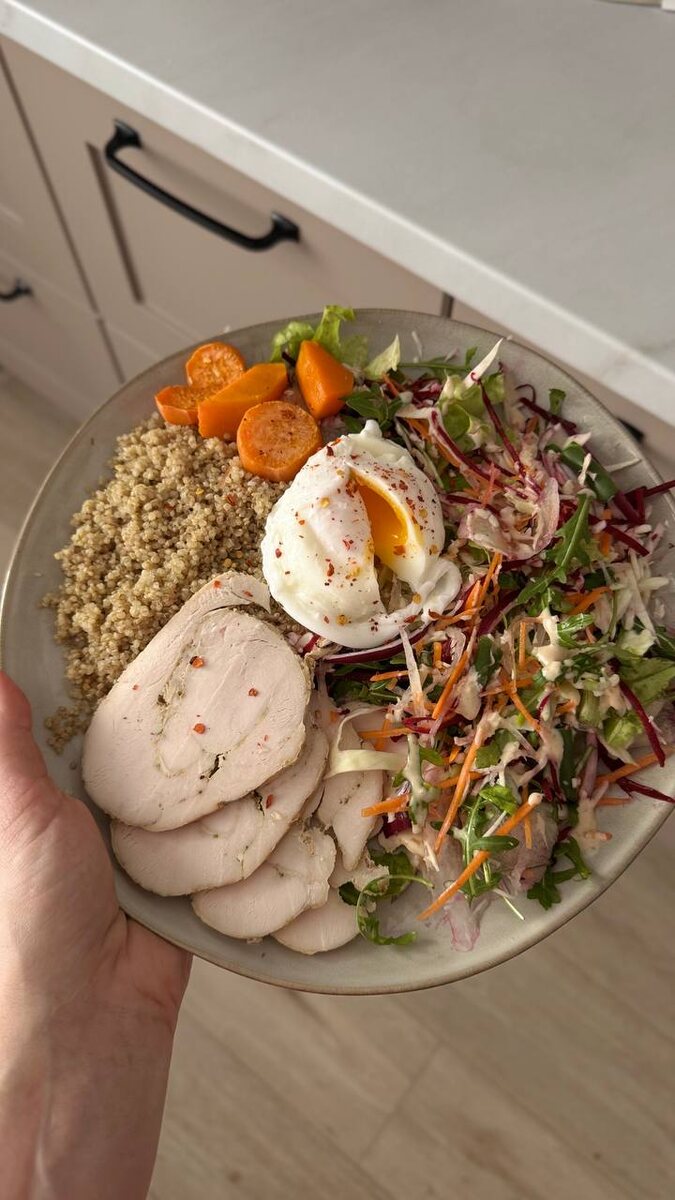 Настругала капусточку, добавила по горсточке овощей из заготовок и вуаля. Индейку запекала в духовке. Грудка у меня была плоскими кубиками. Я её замариновала (соль, копченый чеснок, приправа для мяса, соль), посыпала быстрорастворимым желатином. Свернула в рулет, в пергамент и в фольгу. Убрала на ночь в холодильник, за ночь желатин разбух, утром запекла и получилась ветчина из индейки одним куском. Запекала при 160° 1ч.40 мин. зависит от размера мяса, (за 20 минут до готовности сливаю водичку и открываю мясо, чтобы подрумянить), выключаю и оставляю в духовке до полного остывания. После холодильника режется идеально и не разваливается.