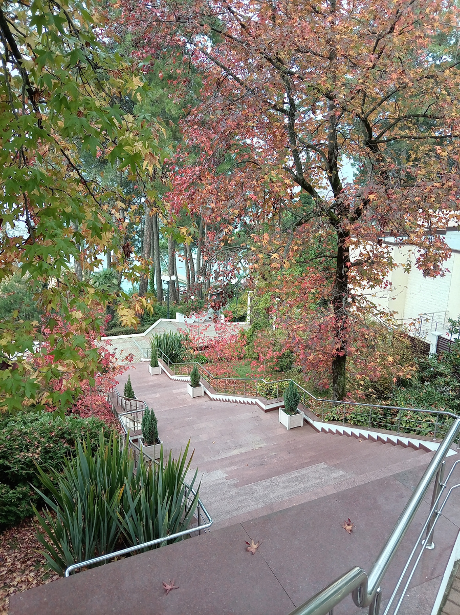 По парку еще разносится медовый аромат абелий, на дорожки падают яркие кленовые листья.