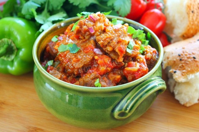 📖 Ингредиенты: * Говядина (мякоть) — 600-800 г * Лук репчатый — 2-3 шт. * Помидоры (или томатный сок) — 400-500 г * Перец сладкий — 1-2 шт. * Чеснок — 3-4 зубчика * Острый перец (чили) — по вкусу * Кинза, укроп — большой пучок * Масло растительное — для жарки * Соль, хмели-сунели, уцхо-сунели — по вкусу 🧑🏻🍳 Приготовление: 1. Говядину нарезать небольшими кусочками, лук — полукольцами. Смешать мясо с луком, добавить немного масла, аджики или лимонного сока, оставить мариноваться на 20–30 минут. 2. В казане или глубокой сковороде разогреть масло, выложить мясо с луком и обжаривать на сильном огне до румяной корочки, помешивая. 3. Убавить огонь, накрыть крышкой и тушить в собственном соку 30–40 минут. Если сока мало — добавить немного воды. 4. Помидоры натереть на терке (или использовать томатный сок), перец нарезать кубиком. Добавить к мясу вместе с солью и специями. Тушить под крышкой еще 40–60 минут, до мягкости мяса. 5. За 5–10 минут до готовности добавить изм