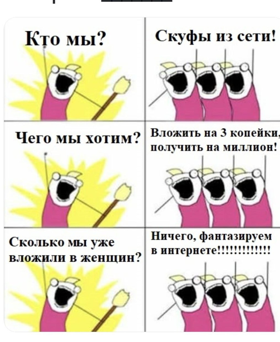 Мужчина, знакомясь, истово верит, что с женщиной в комплекте идет еще эдакий "полный пакет". Ну вот то есть ты познакомился, начал встречаться, и на тебя повалились борщи с пирогами, стирка твоих исподников и тому подобное непотребство. То есть ты никто, но требуешь как муж
