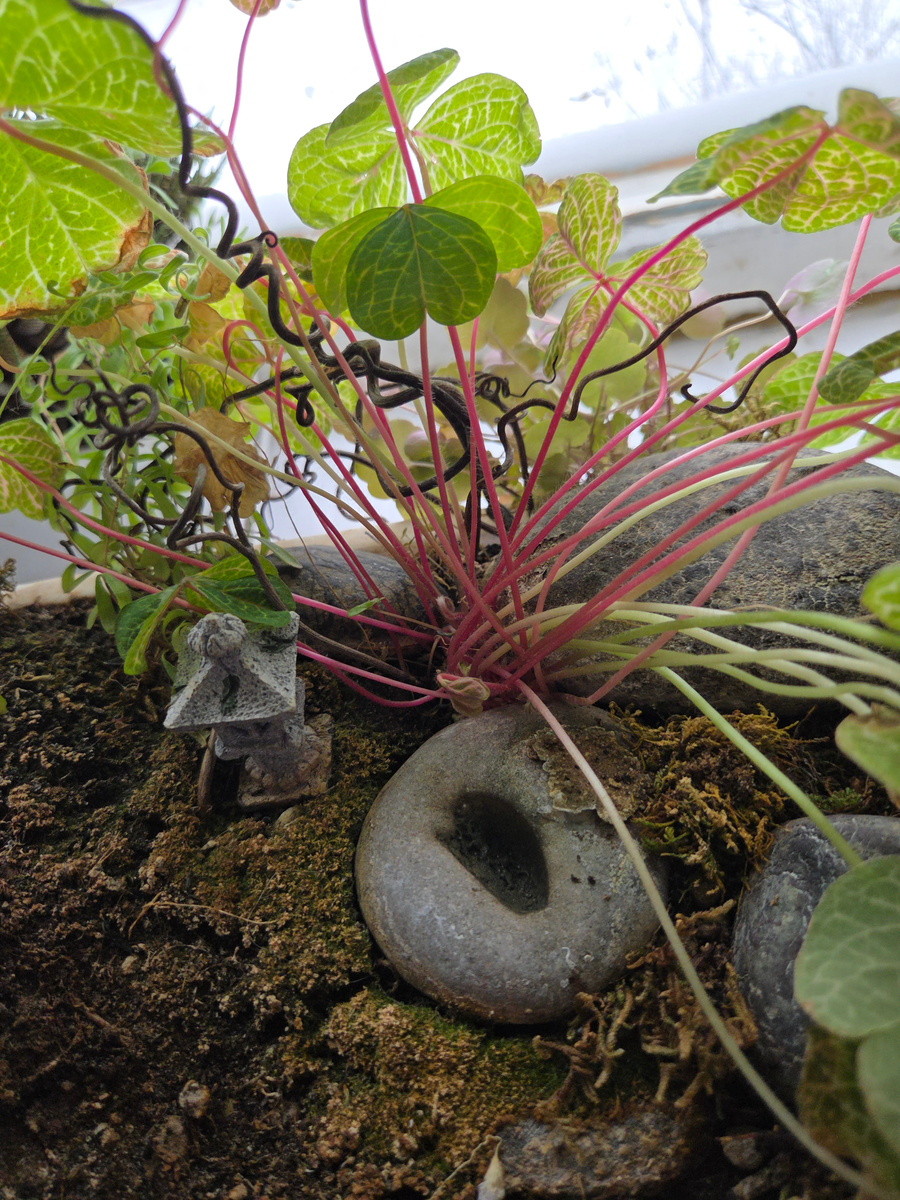 Странно совпало, так что вдруг, внепланово, хотя я не собиралась, занялась посадкой. В планах, конечно, эта работа была, но позже. Надо было высадить из-под почти бонсай из бугенвиллей эту кислицу мартианскую, или тигровую. Уж очень она там зажирела. И, похоже, к воде неравнодушна, т.к. там мини-водоемчик. Точнее, не водоемчик, а камень, на котором сидит фигурка (мы называем эту штуку Будда). Углубление в камне мы частенько (несколько раз в день) заполняем водой, причем так, чтобы вода и весь камень смочила, и мхи вокруг. А рядом с камнем и та самая кислица. Которую я как раз и пересадила в срочном порядке. Вдруг, внезапно, один за одним, два покупателя. После долгого затишья и несостоявшихся покупателей миртов. Нужна мартианская кислица. Осталась ли? Да! Две штуки есть на продажу, два горшочка. В фазе "проснулись и потихоньку тянемся к свету". Одна кислица попышнее (листочков больше), вторая чуть скромнее, но там тоже не одна луковичка. Маленькие, но видно, что они там минимум две и