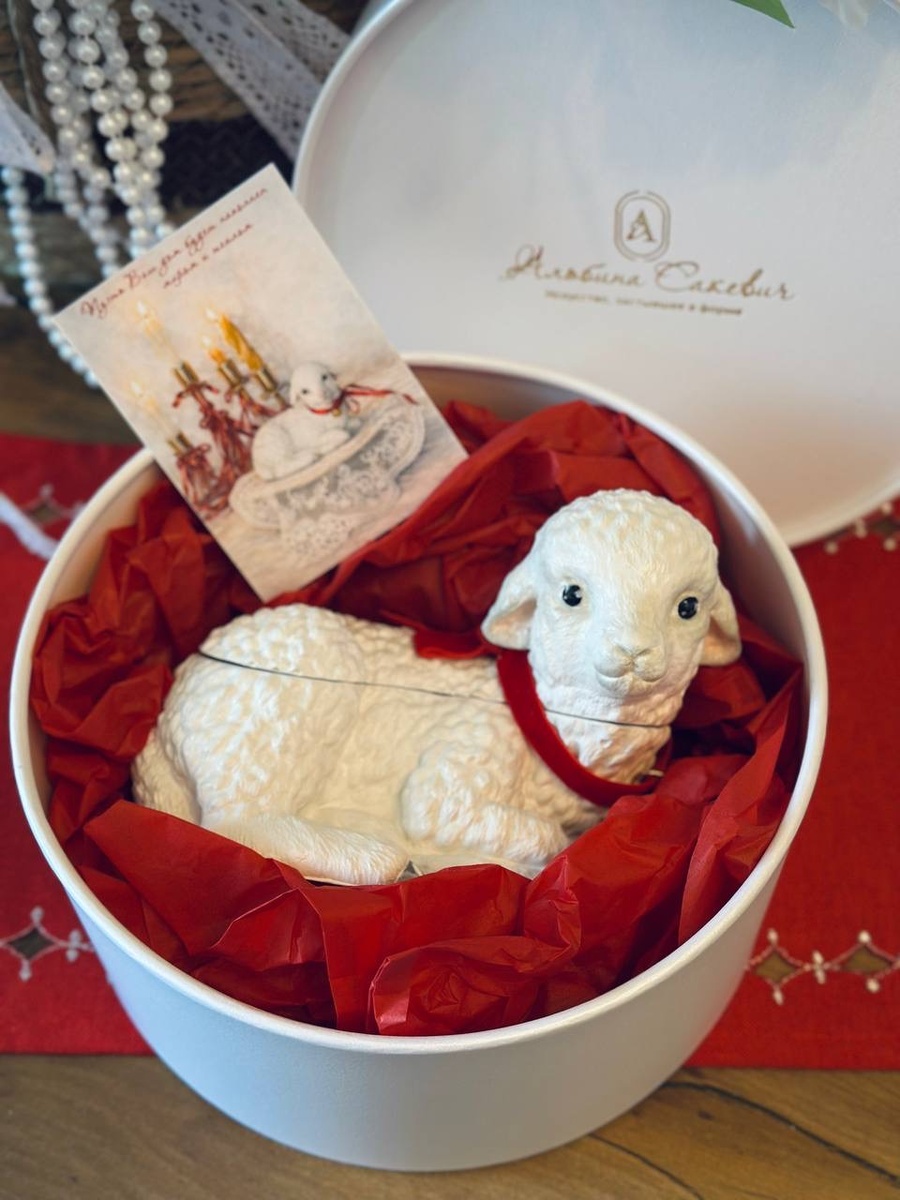 Белоснежный ягнёнок с мягким взглядом и алой бархатной лентой на шее словно создан для особенных дней. Он напоминает о тепле семьи, о тихих вечерах, о доме, куда хочется возвращаться.